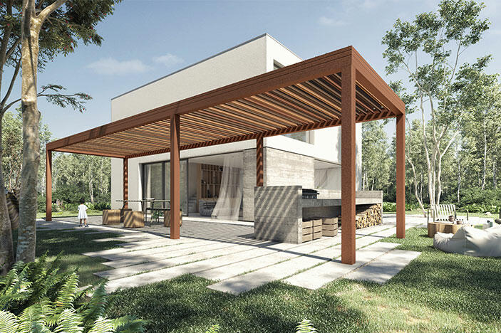 Issues de la nouvelle gamme de laquage ÉCLATS BRUTS® (lancée en avril 2025), ces créations – Copper, Golden et Interstellar – transforment la pergola en véritable signature architecturale.